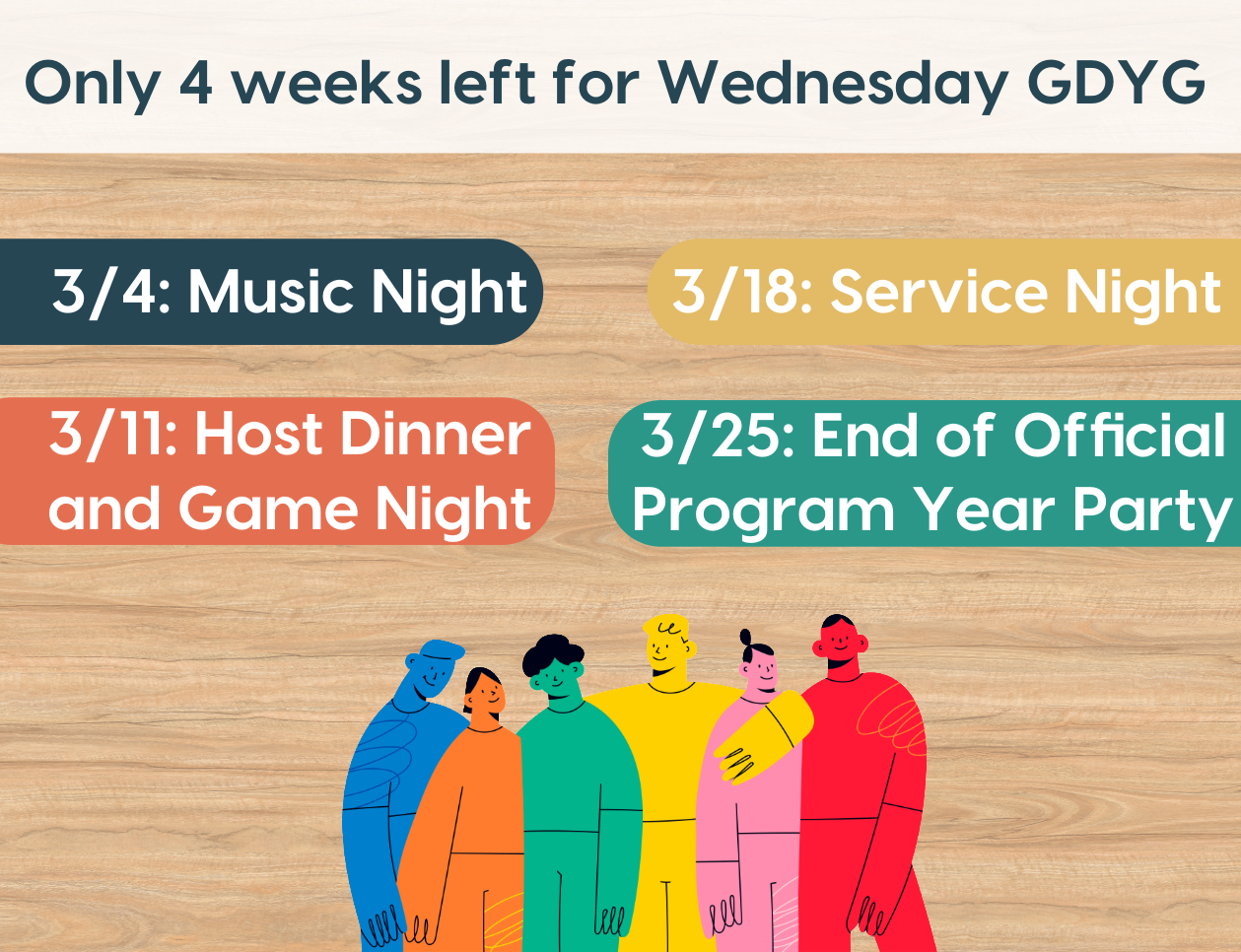 But, GDYG is not over! This Spring we will have Connection Nights and Pop-Up Events so we can keep growing and supporting one another.